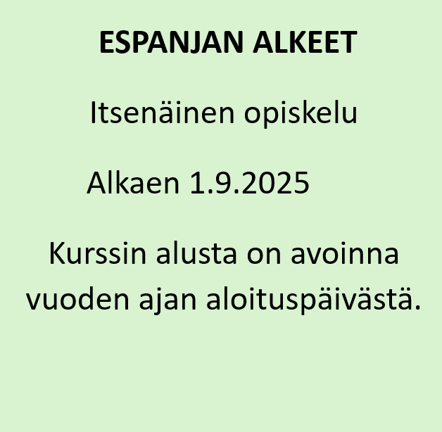 Voit opiskella espanjan kielen alkeet verkossa myös täysin itsenäisesti oman aikataulusi mukaan itsenäiseen opiskeluun suunnatulla espanjan kurssilla. Kurssin alkaessa saat linkin kurssin alustaan, joka on auki kurssitiedoissa ilmoitetun ajan. Kurssin materiaali sisältää kielioppia, paljon harjoituksia, oikeat vastaukset harjoituksiin sekä fraaseja ja pieniä tekstejä erilaisiin jokapäiväisiin aiheisiin liittyen. Kurssin asiat on selitetty lyhyillä videoilla ja kurssin materiaalin voi tulostaa itselleen kurssin alustalta. Voit olla yhteydessä opettajaan kurssin ajan. Opettaja lisää kurssin alustalle kaikki oppilaiden esittämät kysymykset ja vastaukset kysymyksiin.